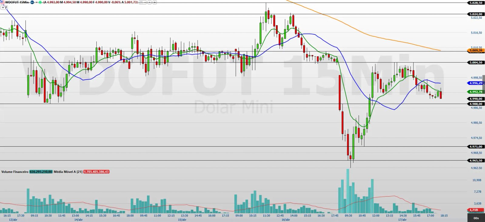 O minidólar (WDOK26), na sessão de 17 de abril, apresentou uma queda de 0,32%, finalizando a 4.990 pontos. Esse movimento indica uma continuidade da pressão vendedora, reforçando o processo corretivo que se observa no curto prazo. O desempenho da moeda americana também foi influenciado por uma leve recuperação no cenário global: o anúncio do Irã sobre a reabertura do Estreito de Ormuz para tráfego comercial trouxe alívio ao mercado, elevando a esperança de uma resolução para o conflito no Oriente Médio. Como resultado, o dólar experimentou uma desvalorização significativa, junto com a queda do petróleo, que se aproximou de US$ 90.
