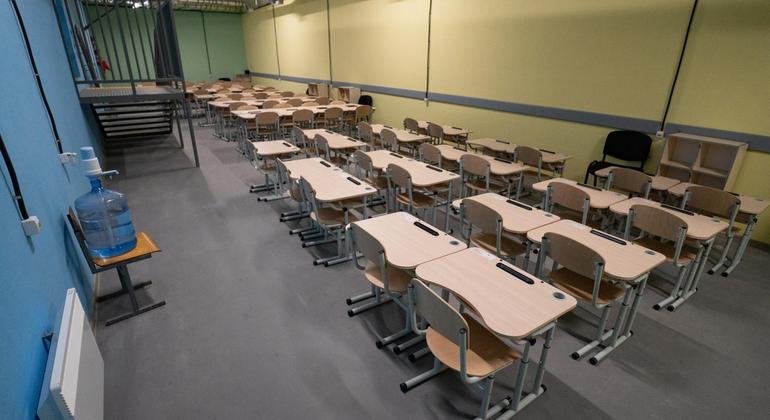 A volta das aulas presenciais em meio a um cenário desafiador: essa é a realidade que muitas comunidades no sul da Ucrânia estão vivendo, com o apoio do Escritório das Nações Unidas de Serviços para Projetos (UNOPS) e da Dinamarca. Este esforço conjunto visa reabilitar abrigos subterrâneos, transformando-os em ambientes seguros para a educação, enquanto as aulas voltam a acontecer.